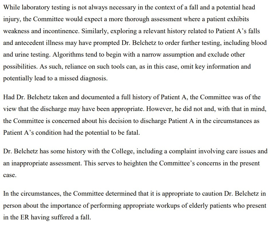The first is Belchetz’ in-person caution from the College of Physicians and Surgeons of Ontario (CPSO) for improper work-up on an elderly patient presenting in the ER, after earlier complaints about his poor care and inappropriate assessments. (In the case for which he was cautioned, Belchetz failed to assess and order routine blood work or urine analysis for a elderly patient with head trauma, leading to an “inappropriate” discharge.)